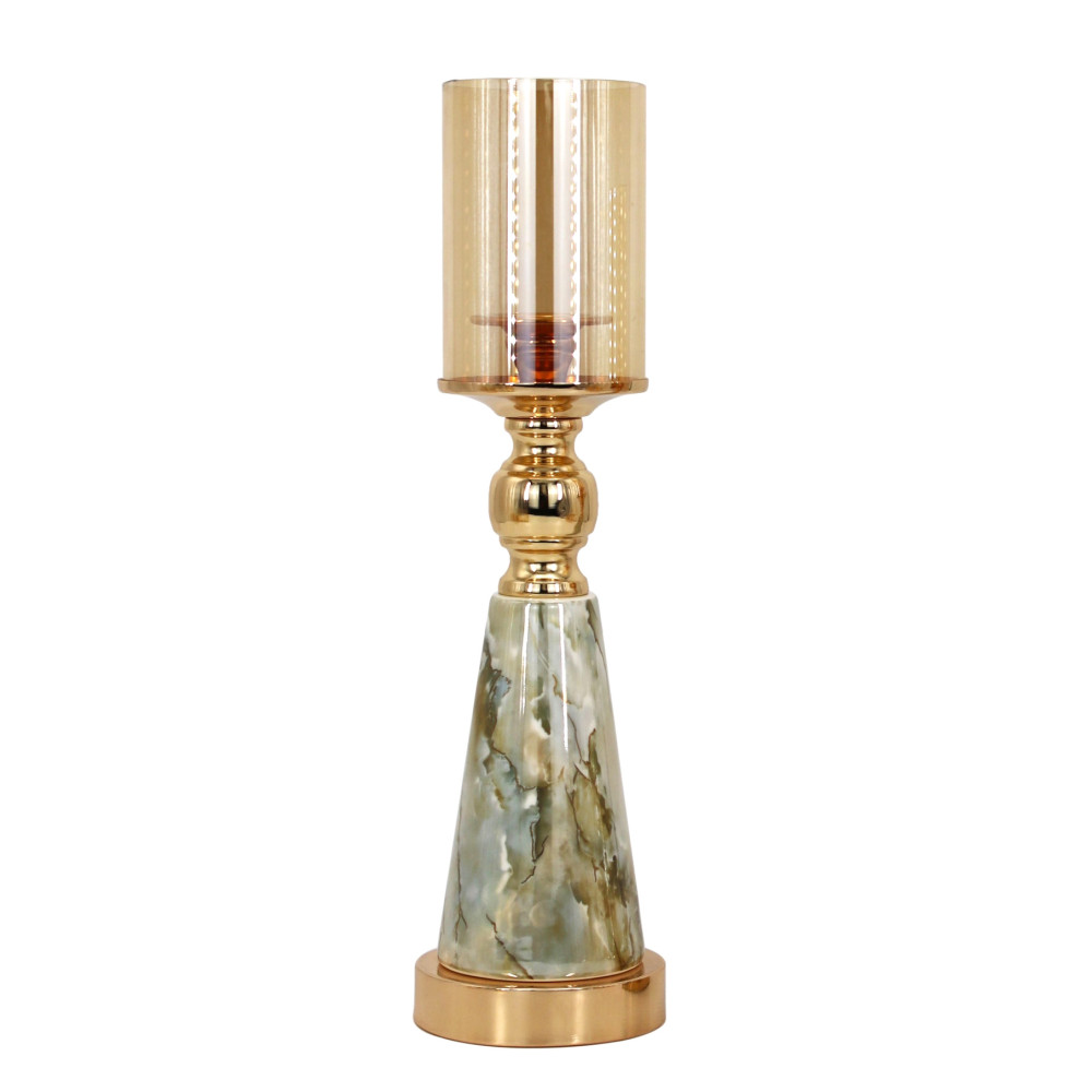 На зображенні представлений елегантний декоративний свічник із поєднанням мармурових і золотистих елементів. Основу виробу становить конусоподібна ніжка з мармуровим ефектом у природних відтінках, що додає йому вишуканості. Верхня частина складається із золотистого металевого тримача з декоративними деталями, що плавно переходять у циліндричний скляний плафон із легким золотавим відтінком. Такий свічник стане чудовою прикрасою для будь-якого інтер’єру, додаючи йому нотки класики, розкоші та витонченого стилю.