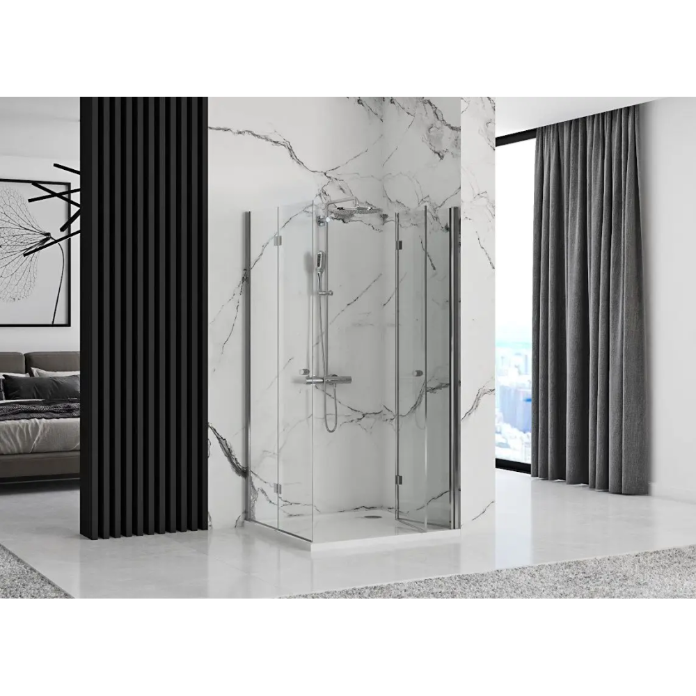 Складна душова кабіна складається з двох скляних дверей із