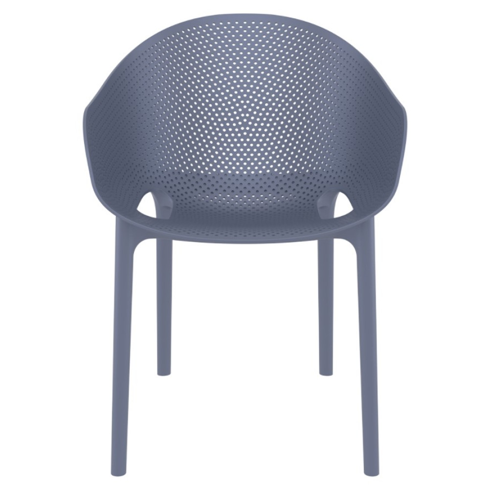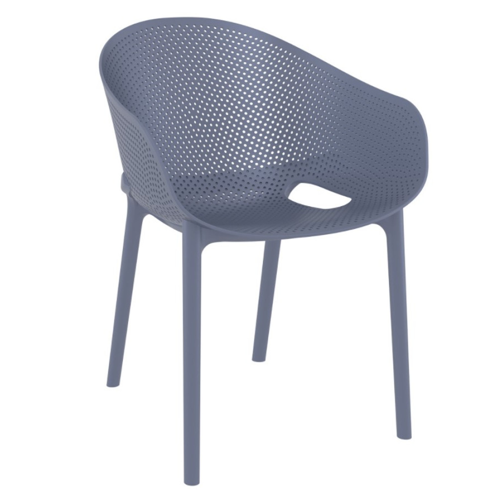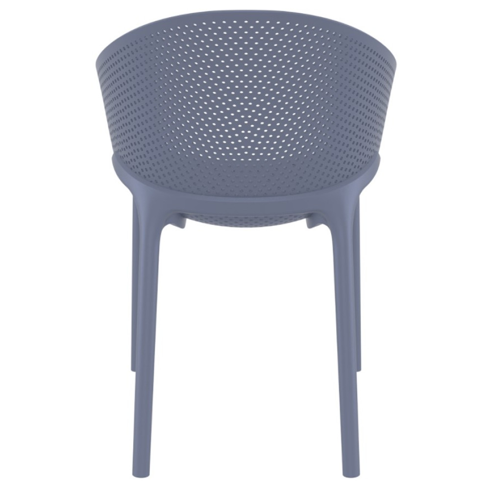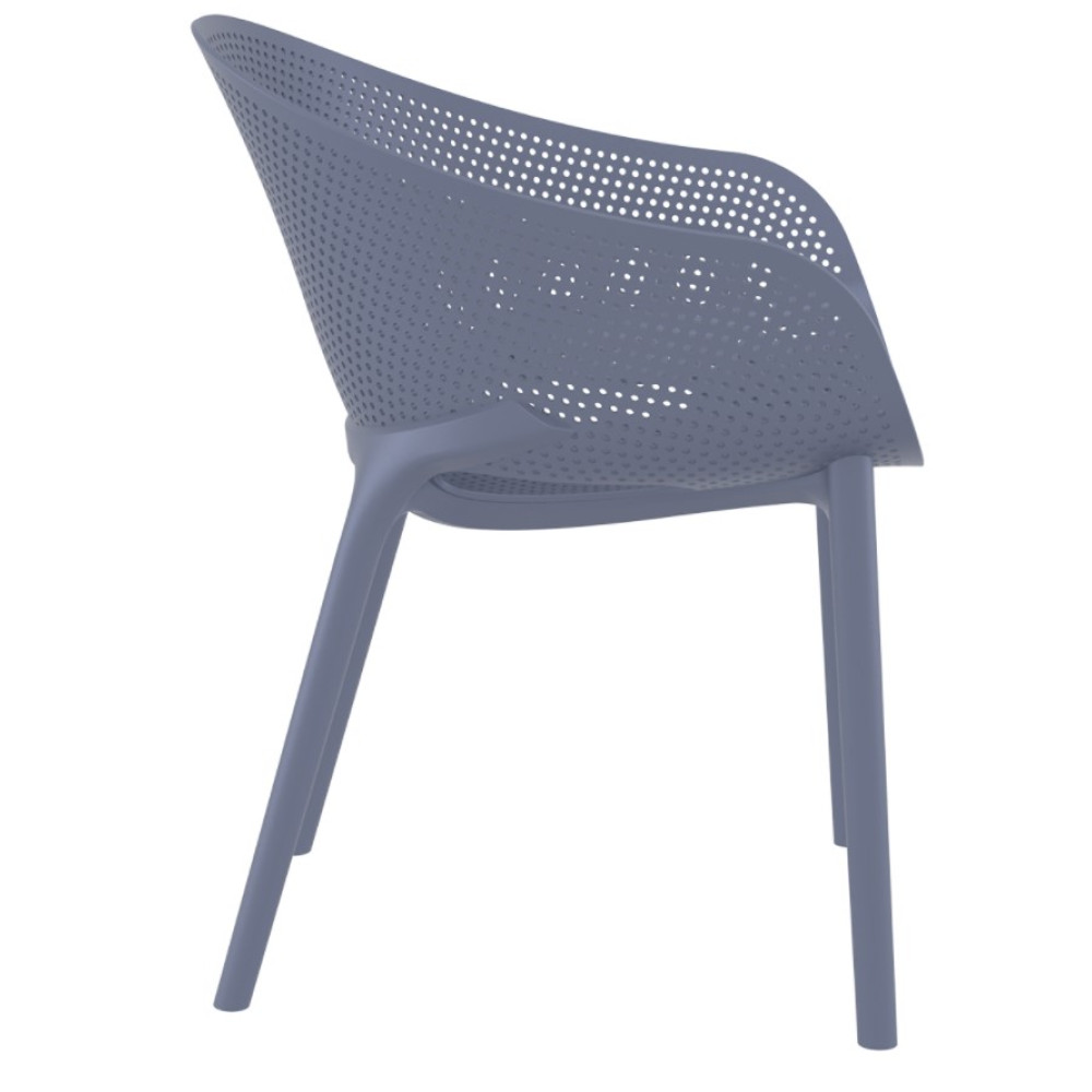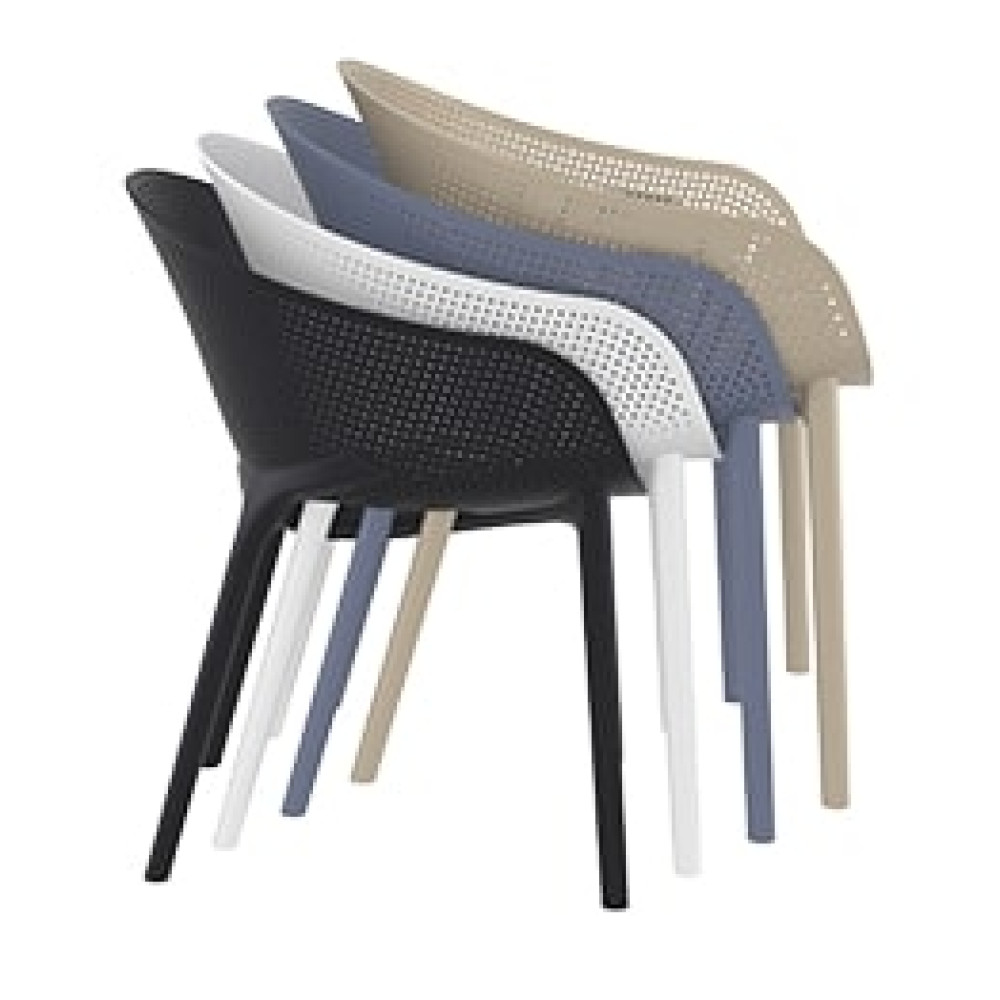Стілець SKY PRO виготовлений з армованого скловолокном поліпропілену. Перфороване сидіння ідеально підходить для використання на відкритому повітрі. Зберігання стільців полегшується тим, що їх можна складати один на одного до чотирьох штук для економії місця.
