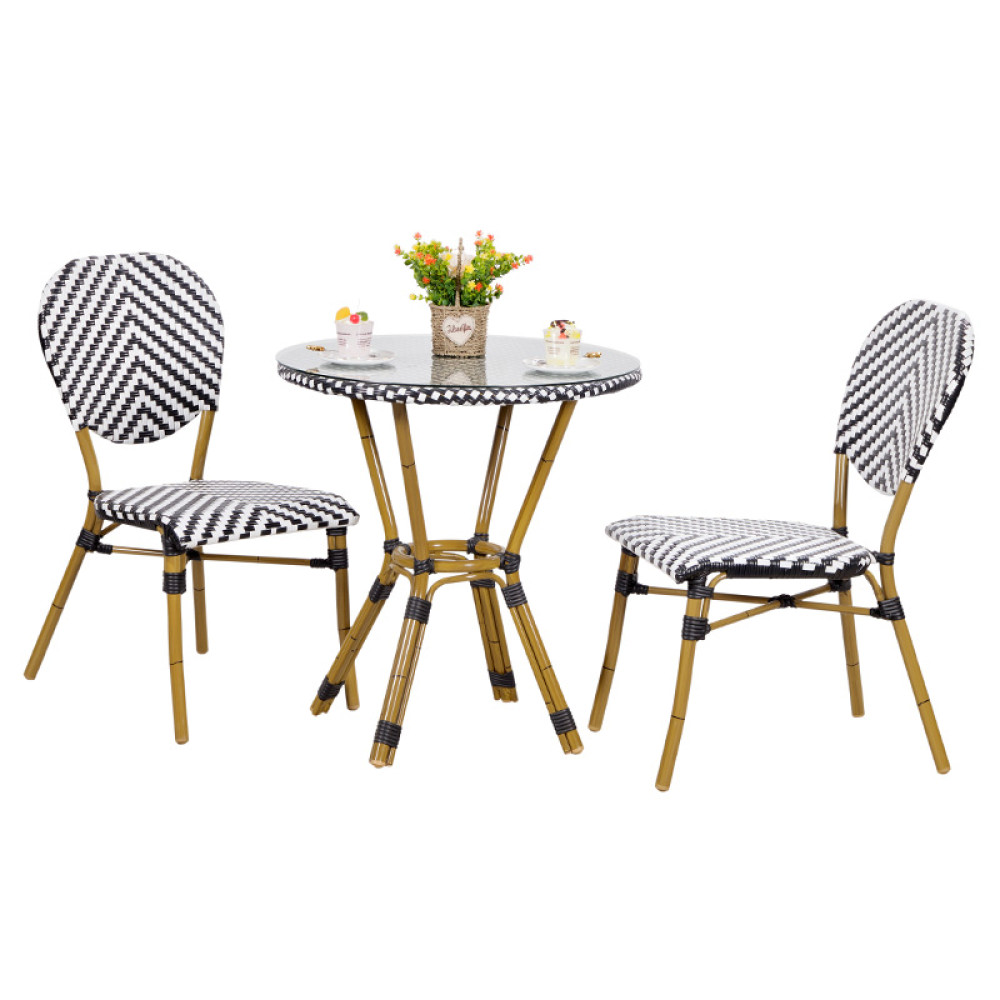 Стіл, що входить до набору, стає центральним елементом вашого маленького французького куточка. Міцний алюміній, обрамлений ротанговим плетінням, підтримує стільницю із загартованого скла, яка додає блиску та елегантності. Вона стійка до подряпин і легко очищується, роблячи стіл практичним і красивим одночасно.