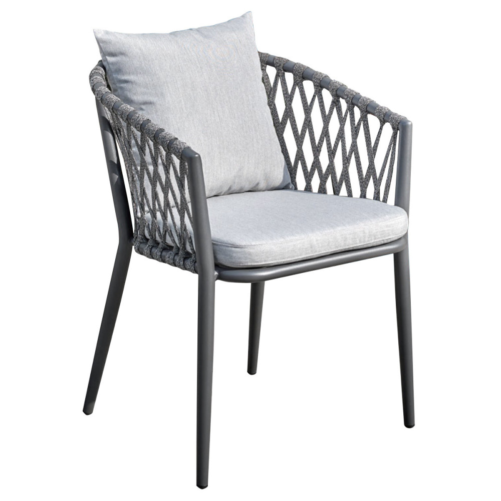 У набір входять стільці розміром 57x62x80 см, виготовлені з легкого та міцного алюмінію, обплетені мотузкою, стійкою до ультрафіолету. Завдяки зварній конструкції стільці міцні та довговічні, а можливість штабелювання полегшує їх зберігання.