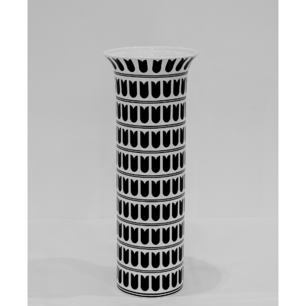 Оригінальна ваза, натхненна архітектурною формою всесвітньо відомої Пізанської вежі. Її циліндрична форма прикрашена характерними арковими елементами, які імітують фасад італійського шедевра. Контрастне поєднання чорного та білого додає вазі графічної виразності та геометричної гармонії.