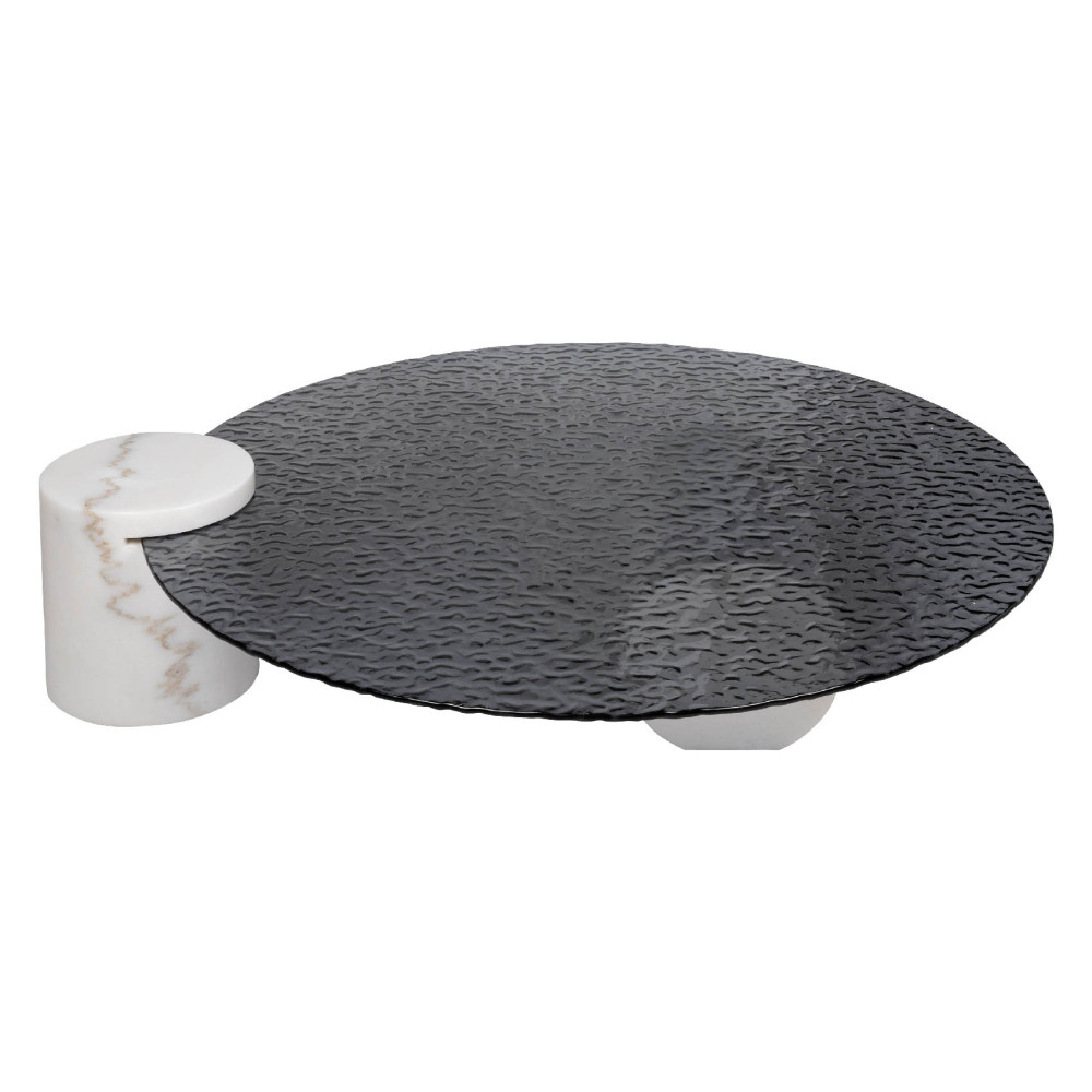 Цей кавовий столик стане центральним елементом будь-якого інтер'єру завдяки своєму оригінальному, геометричному дизайну. Кругла стільниця виконана з хвилеподібного скла, що створює ефектний візуальний акцент. Виконаний у благородному поєднанні білого мармурового кольору з чорним.